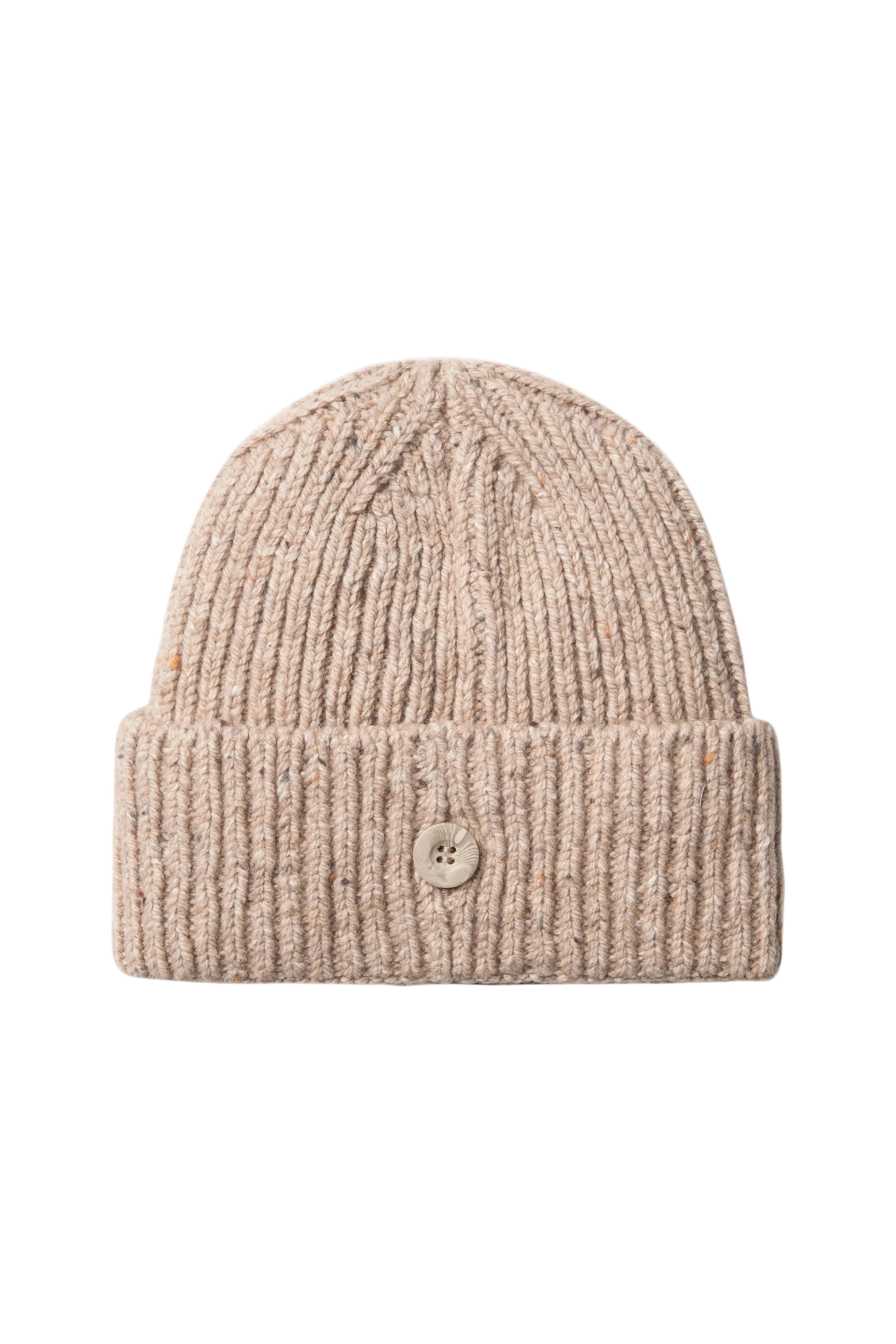 The Anglistic Beanie is knit from a tactile blend of lambswool, cotton, and Acrylic yarn in a stretchy rib stitch, and features a subtly speckled look throughout. Its cuff is detailed with a woven Square Label on the front, and a fixed faux-horn button at the back.